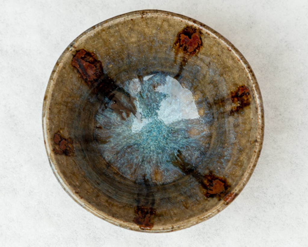 The finest particles, which can take days or weeks to settle, are important for a good melt, so it’s best to be patient. Once settled, the clear water is poured off the top and the material is put into bisque ware and left to dry. If it still has moisture it will be difficult to accurately measure, leading to a lack of consistency. The dry powder is now ready to measure out and mix into a glaze. The last photo is of my first successful pumice/tuff glaze test from 2019, which is now the favorite dining bowl of our cat.